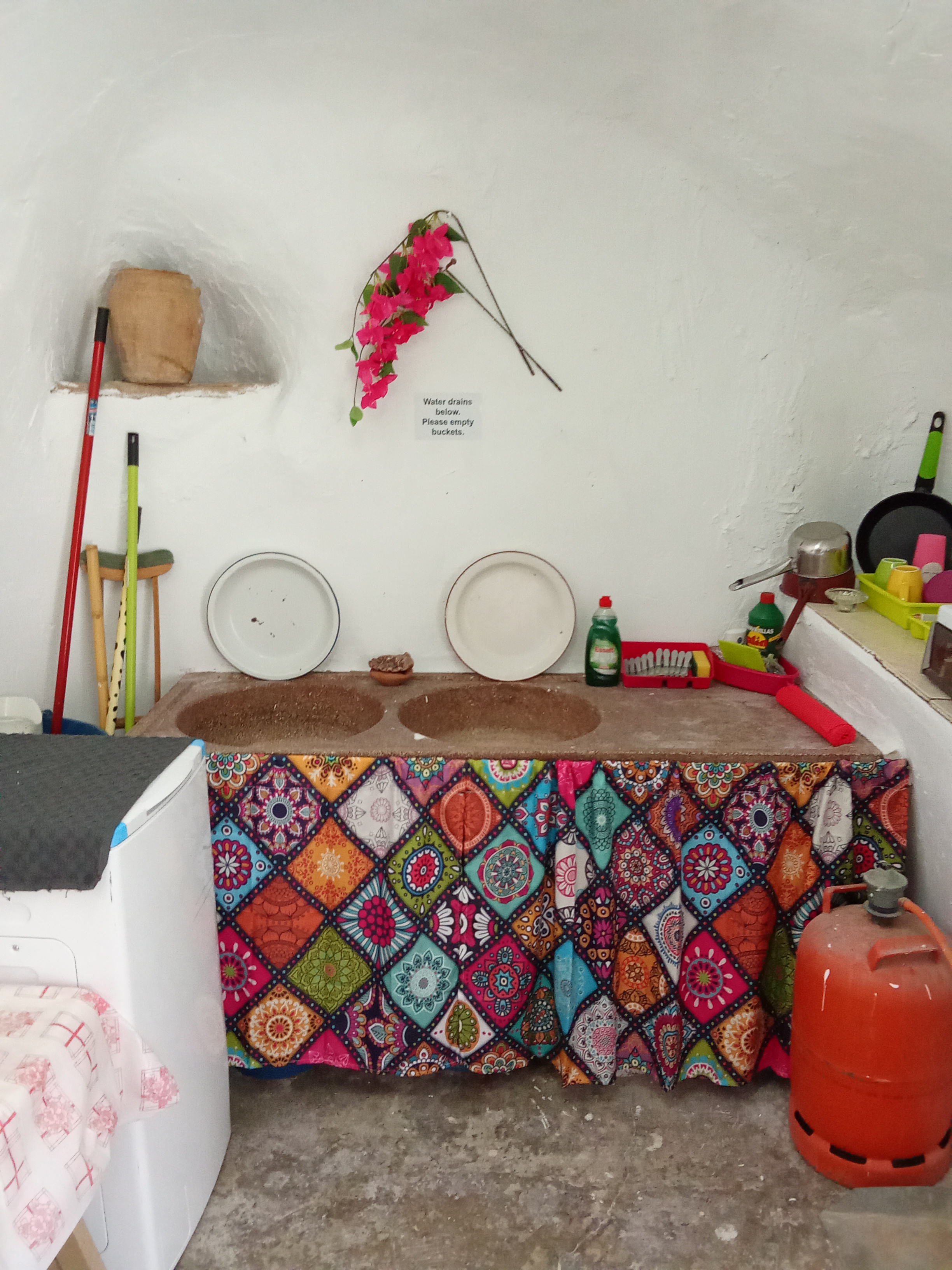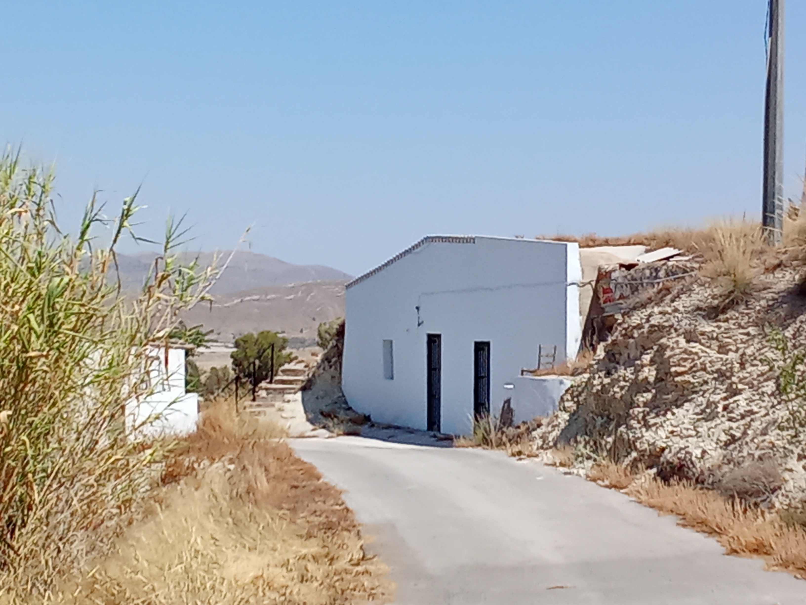 This quirky cave house is located in rural Murcia province Spain. It is classed as the commune of La Zarza, although in reality is on its own with the exception of a row of other neighboring cave houses that originally belonged and some still belong to the original family. Some are permanent residences and some are holiday homes (weekend) only. The cave has, within its main building, two bedrooms, that would sleep five across three beds if needed (two doubles and a single). There is also a sitting room, dining room inside and a kitchen inside (although mind your head!) The cave construction ensures that the interior remains comparatively cool in the hot summer months. In the cooler months, there is a large open fireplace in the sitting room that can be used. There is no other heating in the property. It is important to note that the toilet and shower facilities are located in a small building directly opposite the front of the property. The shower is a pump shower and so in some respects mirrors camping/ asian style bathing albeit you are sleeping in a constructed building. The surrounding area is rugged and scenically stunning, with uninterrupted sunrise and sunset views from the roof of the cave where you can sit and relax. There is an outdoor barbecue area overlooking the Almond Grove and indoor gas stove for cooking. All cooking utensils, pots and pans and crockery are provided. You just need to take your own towels. There is a fridge and a washing machine in the kitchen.